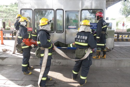 16時演練正式開始,演練模擬收費亭內(nèi)設備短路引發(fā)火災,收費員被困收費亭。下花園區(qū)消防大隊在接到火警后迅速趕往火災現(xiàn)場。消防官兵到達現(xiàn)場后,一組人員在收費站人員的配合下緊急疏散過往車輛及人員,一組人員迅速拉起高壓水槍沖向著火地點控制火勢,實施救人。最終,在消防官兵和收費站人員同共努力下,火勢得到控制,被困收費員成功解救。整場演練緊張有序,取得了預期的效果。